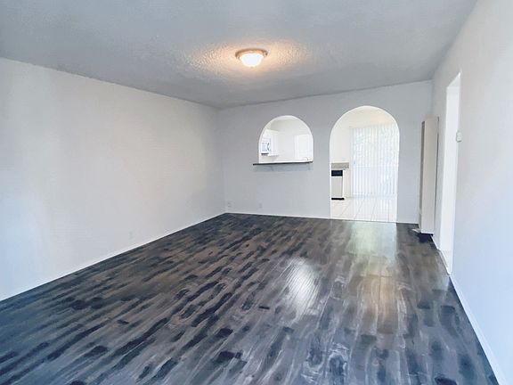 Features fresh paint and wood flooring throughout, a charming arched doorway and breakfast bar, ceiling fan with light on a digital dimmer, large double-pane window with new wooden horizontal blinds, wall gas heater, and wall-mounted A/C unit.