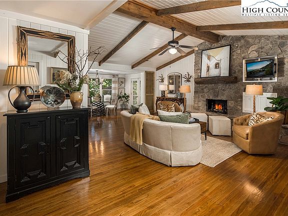 Welcome to this storybook cottage just blocks from the heart of Blowing Rock, offering proximity to fine dining, boutique shopping, museums and churches. Just minutes from the Blue Ridge Parkway, Cone and Price National Parks and Appalachian Ski Mountain. This charming, four-bedroom, four-bath cottage with a single-car garage presents an exceptional opportunity for one-floor living in the Green Park Historic District. It's just around the corner from the legendary Blowing Rock attraction, the namesake of the Village. Although a classic mountain cottage, the home has an open-concept layout and seamlessly integrates a great room anchored by a grand stone fireplace and a light-filled sunroom or dining space — ideal for entertaining. A cheerful kitchen with window to the forest affords the creation of delicious meals. Outdoor spaces are equally inviting. Adjoining the dining area, nestled in the treetops, is a generous deck for outdoor dining and barbecuing. A great place for entertaining and festivities. Enjoy a morning coffee on the front porch framed by mature landscaping and gardens cultivated by a master gardener and filled with native and unusual plants and bushes. It's a private place in nature to unwind, enjoy a book or simply be. The primary bedroom with triple windows is situated on the main level and features an en-suite bath for convenience and privacy. Across the hall is another bedroom, a full bath and a laundry. From the great room, go down the staircase with rhododendron banisters to the lower level. There, you will find a cozy bedroom with built-in bookcases and a large bath. Nearby is a second large bedroom with an en-suite bath that serves as a multi-purpose family room. Go outside and enjoy another large covered and uncovered deck. Plenty of spaces for the separation of generations and for offering privacy to guests. This charming mountain cottage delivers timeless appeal in one of North Carolina's most desirable settings. If you have ever dreamed of an idyllic mountain retreat away from it all, but near all the pleasures of the Blue Ridge Mountains of the High Country, you have found it! The home has been staged, and there is a short list of furniture that will convey at no cost uploaded to the documents. Please note the discrepancy in professional measurements and tax card records. The town of Blowing Rock only maintains permit for six years.