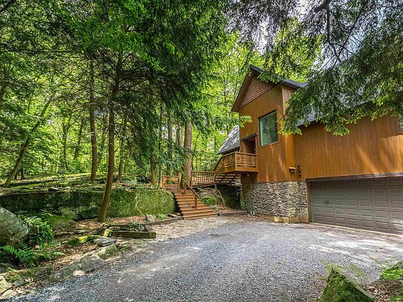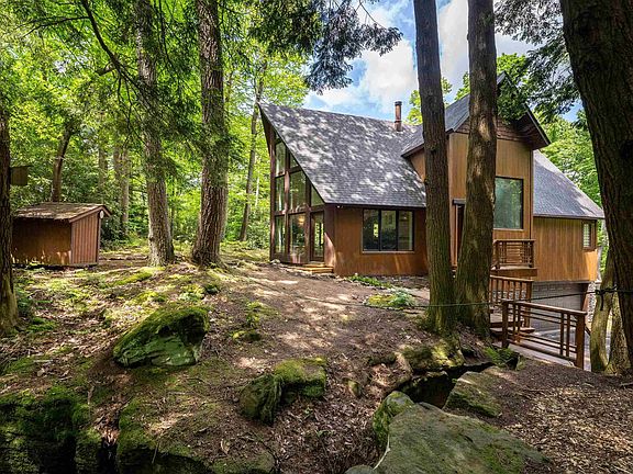 This home is a one-of-a-kind gem tucked away in the woods. Feel instantly welcomed as you enter into the great room featuring a beautiful stone fireplace and a picturesque setting that seamlessly blends indoor and outdoor living. Natural lighting floods this home with large windows throughout. The kitchen features floor-to-ceiling cabinetry and overlooks the rocky landscape. Plus, there's a dumbwaiter to make grocery trips a breeze! The primary suite, located on the main level, includes a full bath, spacious closet and laundry facilities for added convenience. Upstairs, you'll find two bedrooms with large windows and a full bath. The loft area could easily be converted into the third bedroom. There's an addition off the garage that could serve as an office or in-law suite with its own private entrance. Outside, you'll find trails, a deck that wraps around the rocks, wood sheds, disc golf and a fire pit area. This home truly has it all and is perfect for those who love nature and unique features.