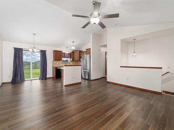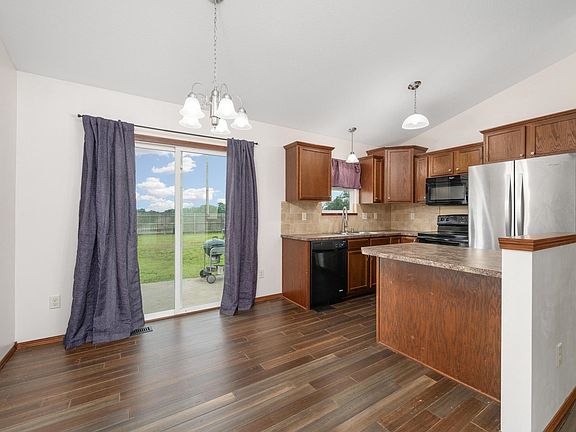 Welcome to this thoughtfully updated home offering comfort, flexibility, and scenic views in the sought-after Sunrise Addition of Rose Hill. With 3 bedrooms, 2 bathrooms, and a versatile bonus room that could serve as a fourth bedroom, office, or hobby space, this home is designed to fit your lifestyle. Upon entering, you will love the open concept living, dining, and kitchen area enhanced by vaulted ceilings, natural light, and upgraded hardwood flooring. The kitchen features a convenient eat-in bar, all appliances included, and flows seamlessly into the dining space, which offers easy access to the back patio—perfect for outdoor entertaining or evening grilling. The main floor includes two bedrooms, each with built-in closet systems. The primary bedroom boasts dual closets, while the full bathroom features elegant travertine tile and a quartz vanity. The finished basement adds even more living space, with fully insulated walls and ceilings, energy-efficient LED lighting, and stylish finishes. A spacious family/rec room is prepped with an electrical upgrade for a projector, making it ideal for movie nights or game days. Behind charming double barn doors lies the oversized bonus room with a small closet and a full wall of built-in storage. The basement laundry room offers additional storage space and convenience. A third bedroom and a beautifully updated second bathroom with a tiled floor and walk-in shower complete the lower level. This home comes loaded with valuable upgrades, including: a sprinkler system, whole-home water filtration system, humidifier, high-speed fiber internet, a scenic, fully fenced backyard, and three-car attached garage. Don’t miss your chance to own this move-in-ready home that blends comfort, modern updates, and peaceful surroundings. Schedule your private showing today!