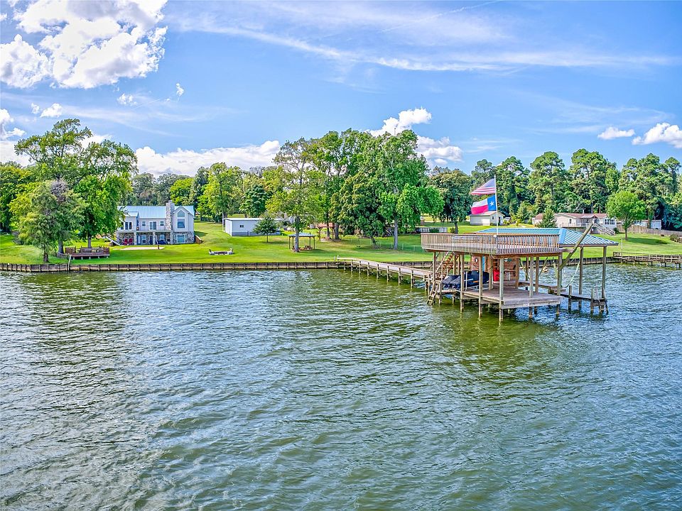 This stunning new home features one of the most breathtaking views of any location on Lake Livingston. This 3 acres of unrestricted land includes a beautiful new 3 bedroom 3 bathroom home that is situated to maximize the lake views with many luxury features like marble countertops, custom cabinetry, 2-story indoor/outdoor fireplace, large windows, spacious game room with a bar, and extensive decking and patio space; as well as a new double decker boathouse, recently installed bulkhead, outdoor stone fire pit, pergola patio, lakeside deck, back up generator, and a detached garage/workshop. Only 1 hour North of Houston