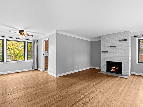 This home features refinished hardwood floors throughout the living room, bedrooms, and hallway, with tile flooring in the kitchen and bathroom. The spacious living room boasts a classic brick fireplace, perfect for cozy nights in. Enjoy central air conditioning for during the warm months for extra comfort.