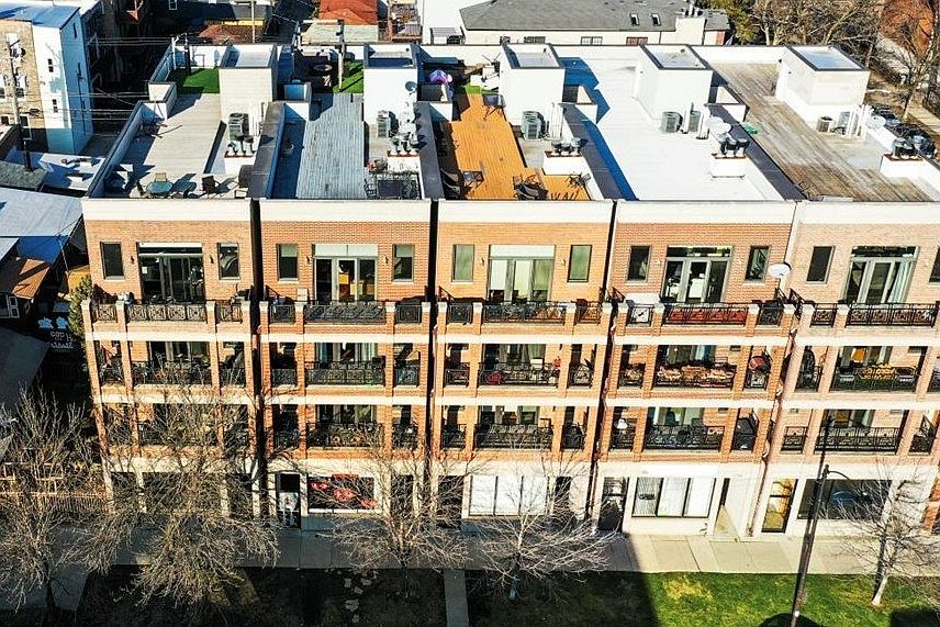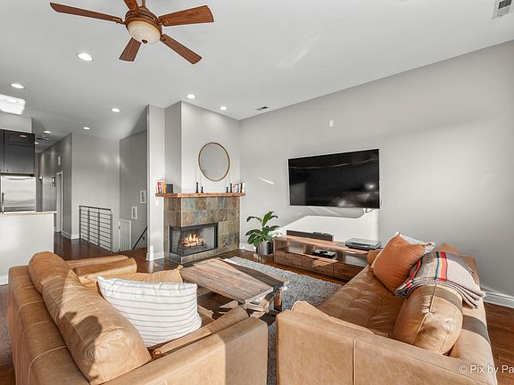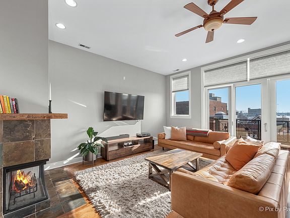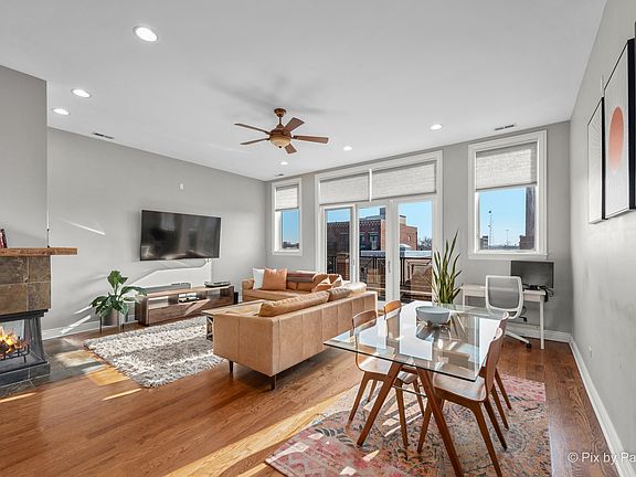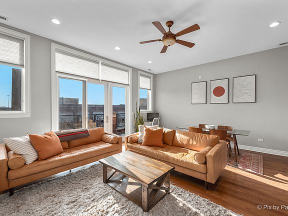 You don't want to miss this absolutely stunning 3 bedroom, 2 bathroom home providing luxury living in the sought after West Town neighborhood! This penthouse home spanning 1,700 SF lies in a beautiful, quaint building featuring sophisticated elegance from the moment you enter the entryway foyer. This city oasis is flooded with an abundance of natural sunlight from the expansive South facing windows and the coveted front balcony spanning the entire width of the unit. The gorgeous open concept living room/dining room complimented by hardwood floors and 11' ceilings throughout, showcases an incredible gas or wood burning fireplace surrounded by beautiful tile and a reclaimed custom wood mantel, adding to the home's charm. The kitchen boasts an eat-in island, granite countertops, 54" walnut cabinets, subway tile backsplash, and stainless steel appliances, including a range hood, while leaving plenty of space for a formal dining room table. The generously sized tranquil primary suite offers a second private walk out balcony and features a spa-like en-suite bath with a dual sink vanity, Whirlpool tub, and a separate glass enclosed shower. And that's not all - the home offers a private rooftop space which is an entertainer's dream. The private rooftop space includes a beautiful 16x8' cedar post pergola strung with elegant weather-proof lighting, a propane fireplace, three planters, and a large U-shaped couch, perfect for hosting family and friends and all included in the sale of the home. This private rooftop area is in addition to the partially shared rooftop deck which offers stunning sunsets and endless skyline and city views. This amazing home lies in a fantastic location within easy walking distance to many public transportation options, Smith Park, and many local, privately owned shops and restaurants. In-unit washer/dryer and two car tandem parking included. Welcome home!
