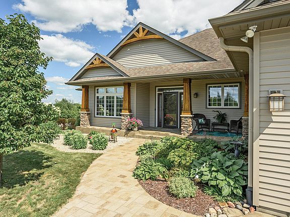 Outdoor spaces are exceptional, featuring a 56x23 stamped concrete patio with a hot tub inside an enclosed gazebo, a heated pathway, and a retractable awning for shade. The fenced-in, partially above-ground pool is perfect for summer relaxation. The property also includes a vineyard, extensive perennial gardens, natural prairie plantings, and a fenced-in garden with pear and apple trees, a raspberry patch, raised beds, and a custom chicken coop with a gardening shed. Enjoy breathtaking valley views, frequent wildlife sightings, and picturesque sunrises from the backyard. Additional highlights include a 13x11 screened-in porch with a ceiling fan and sound system, a newer heat pump (2021), HVAC system (2021), brand-new roof (2024), and fresh paint (2025). This remarkable property offers an unparalleled blend of elegance, comfort, and natural beauty.