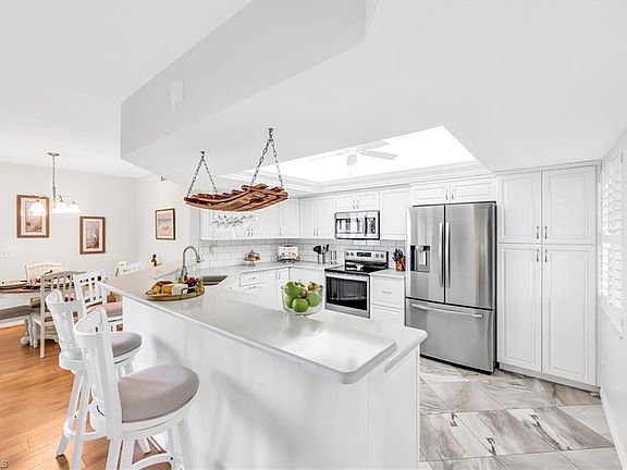 GORGEOUS - LAKEFRONT - COVERED PARKING - GROUND FLOOR – TURNKEY - REMODELED. This Stunning 2 bedroom/2 Bath Lakefront Condo in Lakeside is a rare opportunity and it boasts an open-concept Custom Kitchen designed with the wall removed to create a spacious living area that maximizes breathtaking lake views. The New Kitchen has custom cabinetry with ample storage, stainless steel appliances, a large deep sink, Silestone countertops and enhanced with recessed lighting and a tray ceiling for added elegance. The Master Shower and Guest Bath have been remodeled with high profile vanities with granite countertops, upgraded fixtures and beautiful lighting throughout. Other Features include a huge walk-in closet, plantation shutters, a Newer HVAC System, a Mounted TV in the main area and upgraded lighting & fans. The condo also has manual accordion hurricane shutters and a tiled entry with two large storage closets. Lakeside is a gated community with a 40-acre lake and offers many amenities, including two swimming pools, spa, and a two-story Old Florida clubhouse, complete with sauna, weight room, shower, kitchen facilities, library and game rooms. Lakeside also features five clay tennis courts, tot playground, pickle ball, shuffleboard, bocce and basketball courts. A 1.5 mile walking path meanders through an award-winning lush landscape including two lighted lake fountains. Lakeside is located close to everything - 5 minutes to Mercato, 10 minutes to Vanderbilt Beach & only 20 minutes to downtown Naples.