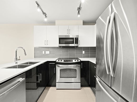 U-shaped kitchenStainless steel appliancesQuartz countertopsGenerous cabinet space