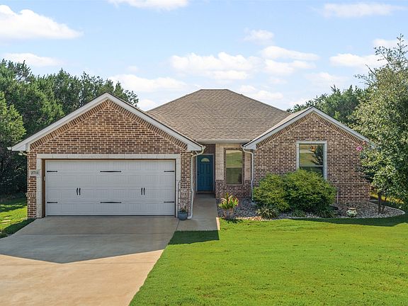 Welcome to this charming 2019-built brick home offering timeless curb appeal and a well-designed single-story layout. Inside, you’ll find 3 spacious bedrooms, 2 baths, and an open-concept living, dining, and kitchen area filled with natural light. The stylish plank tile flooring flows seamlessly throughout—no carpet—making it both beautiful and practical. The kitchen is a standout with granite countertops, breakfast bar seating, stainless steel appliances, double sinks, and rich stained cabinetry. The large primary suite features a recessed ceiling and impressive ensuite complete with dual granite vanities, a walk-in shower, and a sliding barn door leading to a generous walk-in closet. Two additional bedrooms, a full bath, and extra storage complete the interior. Step outside to enjoy the fully fenced backyard, covered porch, and sprinkler system that keeps the landscaping and flowerbeds lush year-round. On the side of the home there is just enough space for a boat or utility trailer. Located in a gated community, residents enjoy access to swimming pools, tennis and basketball courts, playgrounds, fishing docks, boat ramps, and more! Just minutes from Lake Granbury and an easy commute to downtown Granbury or Glen Rose, this clean, move-in ready home has it all.