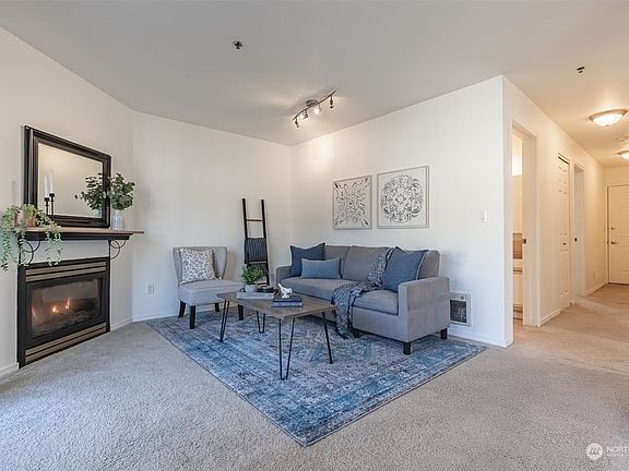 Bright and cozy corner unit within minutes to amenities, bus line, downtown Bellingham and I-5! Enjoy two ample-sized bedrooms with en suite bath in the primary bedroom. Gas fireplace provides great warmth & ambiance throughout, plus, natural gas is already covered by the HOA dues! Spacious kitchen features stainless steel appliances, a new faucet and options to dine up at the counter bar, or within the more formal dining space off the kitchen. Spacious & fully covered deck for prime relaxation!