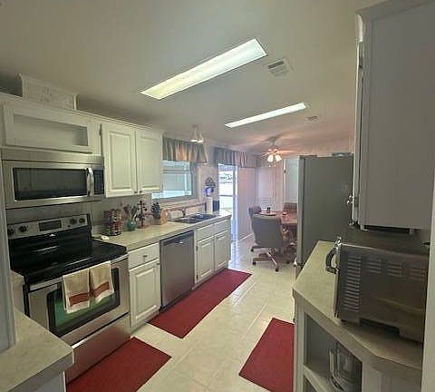 Welcome to this beautifully maintained 3-bedroom, 2-bath mobile home nestled in a 55+ Florida community. The home updates and care are clearly evident-pristine flooring, freshly painted walls, modern light fixtures. All three bedrooms are generously sized; the master suite boasts an en-suite bath with a walk-in shower and a large closet. The additional two bedrooms share a full guest bath, offering flexibility for visitors, hobbies, or a home office. Outside, the home sits on a beautifully landscaped lot within the community-low maintenance, yet lush and inviting. A covered carport and lanai, tidy outdoor patio provide relaxing spots to enjoy Florida's mild weather. Located in an adult community that emphasizes ease and active living, the park offers amenities and landscaping that reflect a strong sense of pride and upkeep. With everything in "move-in ready" condition, this home perfectly blends comfort, convenience, and a serene retirement-friendly lifestyle.