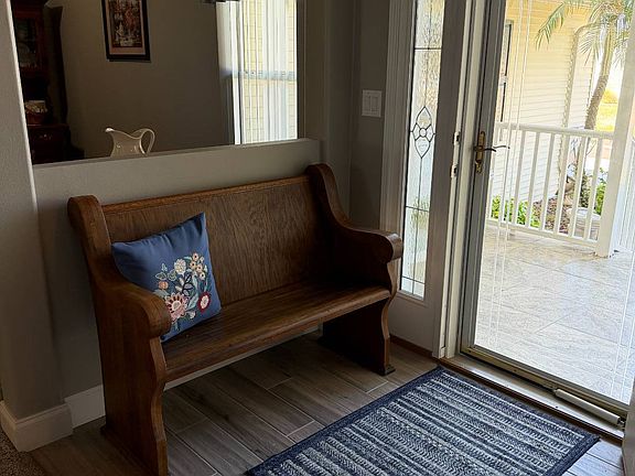 Spacious 2,000 sq. ft. three-unit open-concept mobile home in a peaceful 55+ Florida community - 2 bedrooms, 2 full baths, fully furnished office and a light-filled living area that flows effortlessly into the modern kitchen, perfect for entertaining. Relax with serene water views from the private screened-in patio as well as the large lanai that boasts a queen murphy bed for extra guests. This home comes fully furnished so all you have to do is walk in and enjoy! The beautiful well-maintained residence also includes architectural upgrades, a covered front porch with porch swing, a two-car garage with a separate workshop area, plus an additional enclosed garage space for your golf cart. Enjoy peace of mind knowing the roof is less than 5 yrs. old, along with the AC, PLUS A 10 YR. WARRANTY! Rest easy with the low-maintenance landscaping and single-level living designed for comfort and convenience in a friendly, active community.