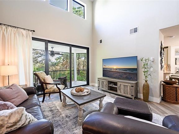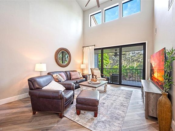 This beautifully remodeled 3-bedroom, 2.5-bath townhome in the heart of Bonita Bay offers dramatic 20-foot vaulted ceilings and expansive transom windows that fill the home with natural light. The main living area flows into a bright kitchen with NEW stainless steel appliances, quartz countertops, cabinets, and updated flooring, paint, and bath vanities throughout. Relax on the enclosed lanai just off the kitchen or step out onto the upstairs balcony from the primary suite overlooking the lush golf course setting. The townhome also features NEW hurricane-impact resistant windows and doors, a full-sized washer and dryer in a laundry closet, and an attached 2-car garage. Fully furnished and turnkey, the home includes multiple TVs, extra linens, pillows, towels, blankets, and a fully stocked kitchen for complete convenience. Residents of Bonita Bay enjoy an unmatched lifestyle, with access to a private Beach Club with complimentary shuttle service, miles of walking and biking trails, a marina and boat house, pools, and spas. Oakwood at Bonita Bay places you just minutes from fine dining, shopping, and the Gulf beaches. AVAILABLE MARCH APRIL 2026 (not available January February 2026), this property provides the perfect seasonal retreat to experience the best of Southwest Florida.