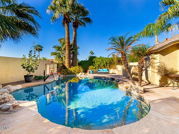 This charming single-story pool home awaits you in Chandler - NO HOA! Nestled on a prime corner lot, featuring 3 bedrooms, 2 bathrooms & a 2-car garage. The interior showcases wood-look flooring, vaulted ceilings, plantation shutters, and an earthy palette that creates a cozy ambiance. The galley-style kitchen boasts white cabinetry, granite countertops, and built-in appliances for a seamless cooking experience. Relax in the main suite, offering a full ensuite with dual sinks for convenience, a closet, and easy outdoor access. Out back, you'll have your private oasis, complete with a covered patio with flagstone flooring, a built-in outdoor kitchen, a curved bench with a fireplace to ensure cozy winter evenings, and a sparkling pool for a refreshing time! Hurry up, this gem won't last!
