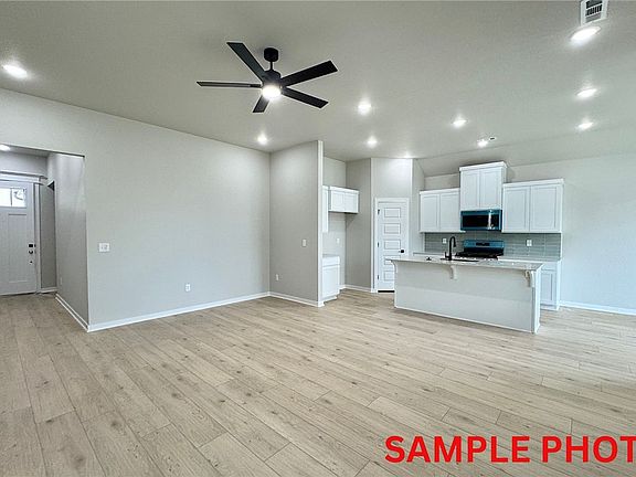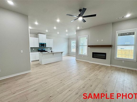 Fence, blinds and gutters included! Discover your dream home in the new neighborhood- Jacob's Crossing. Benton plan with garage on the right and South facing! Select your exterior and interior packages! 10 ft ceilings in the living/kitchen area, linear electric fireplace in the living, 1 level, LVP flooring throughout the main living areas and primary bedroom, quartz countertops and more. Chef's kitchen boasting frigidaire stainless steel appliances, gas range, pantry, quartz countertops, bar pull handles, large island and gorgeous backsplash. Luxurious primary bedroom features abundant natural light, while the spa-like primary bathroom offers a walk-in shower, double sinks, and spacious walk-in closets. Additional features include three large secondary bedrooms and a separate laundry room. Nestled on a generous lot with covered patio that overlooks the serene sodded, fully fenced backyard. Sturdy concrete siding! Model home located at 3631 Tranquility St- Lot 1.