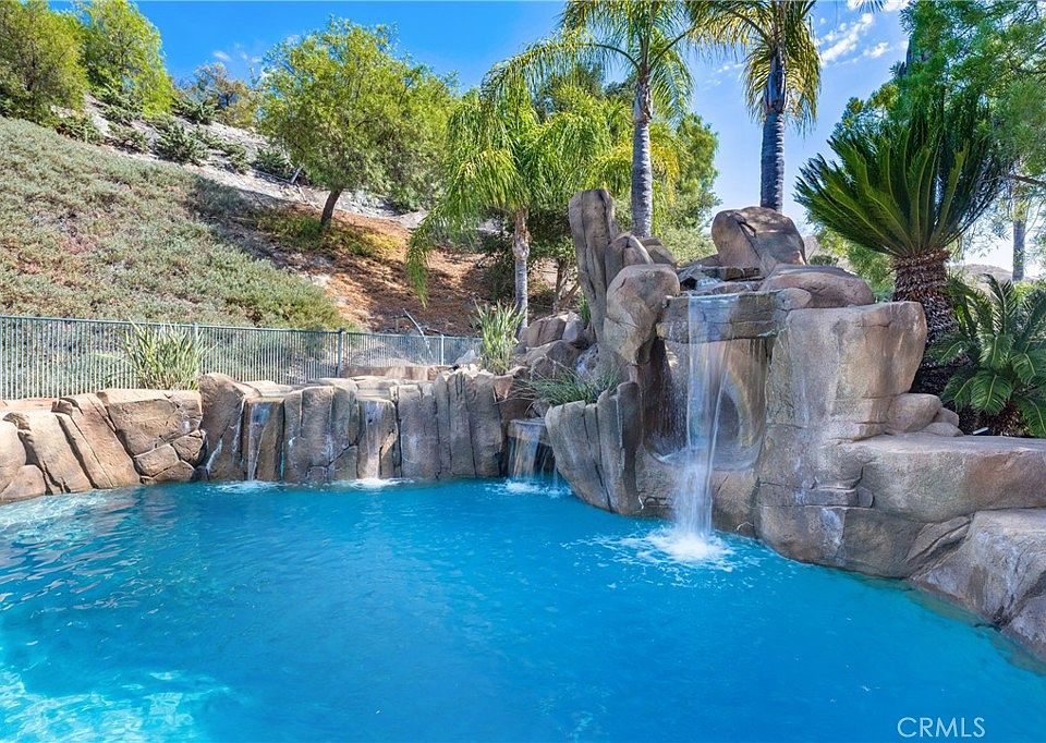 Backyard: pool & spa, waterfall & slide, outdoor shower, built-in BBQ, outdoor fireplace