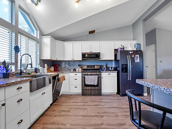 Level useable landLarge fenced backyard areaLarge islandStunning kitchenFarm sinkOpen floor planBlack stainless appliance