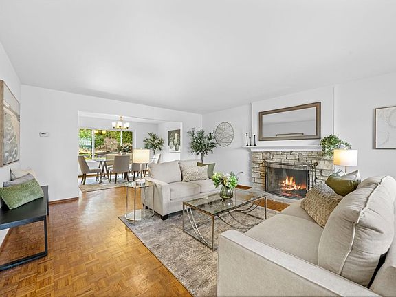 Additional highlights include a two-car attached garage, dual-pane windows, central heating, a laundry room, a dishwasher, and two fireplaces. The large backyard offers a natural setting with mature landscaping, extending the living space outdoors for year-round enjoyment.