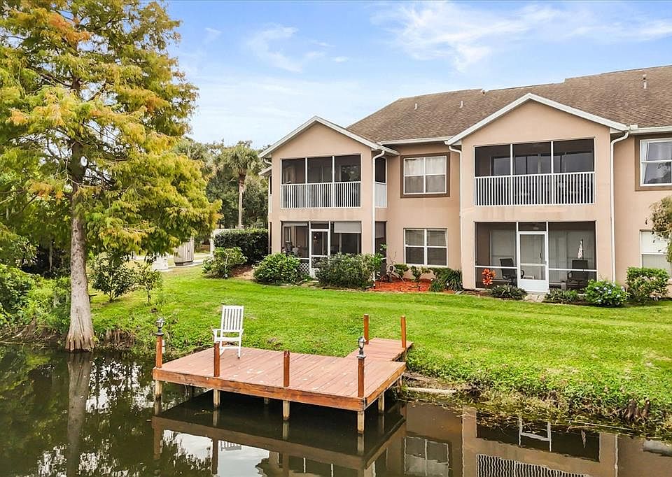 This thoughtfully updated and fully furnished 3-bed, 3-bath corner unit offers over 1,800 sq ft of inviting living space, featuring fresh paint, new luxury vinyl flooring, and a fully renovated kitchen with custom cabinetry, elegant finishes, stainless steel appliances, and a brand-new refrigerator. You’ll love the handcrafted wood accents that bring warmth and character throughout the home. Step outside to enjoy two screened patios, each offering direct access to your private boat dock on the peaceful canal that leads to Fish Lake — perfect for fishing or relaxing by the water. The spacious primary suite includes its own patio, a 12-ft walk-in closet, and a spa-inspired bathroom. Additional highlights include a separate work area with built-in storage, a full laundry room, a one-car garage with overhead storage, a new hot water heater, and an updated electrical panel for added peace of mind. This is the only corner unit in the community with two patios and water access from both. HOA Covers cable, internet, sewer and trash. Conveniently located near Neocity, one of Central Florida’s most exciting up-and-coming areas. Everything seen is included! Just bring your suitcase and move right in!!