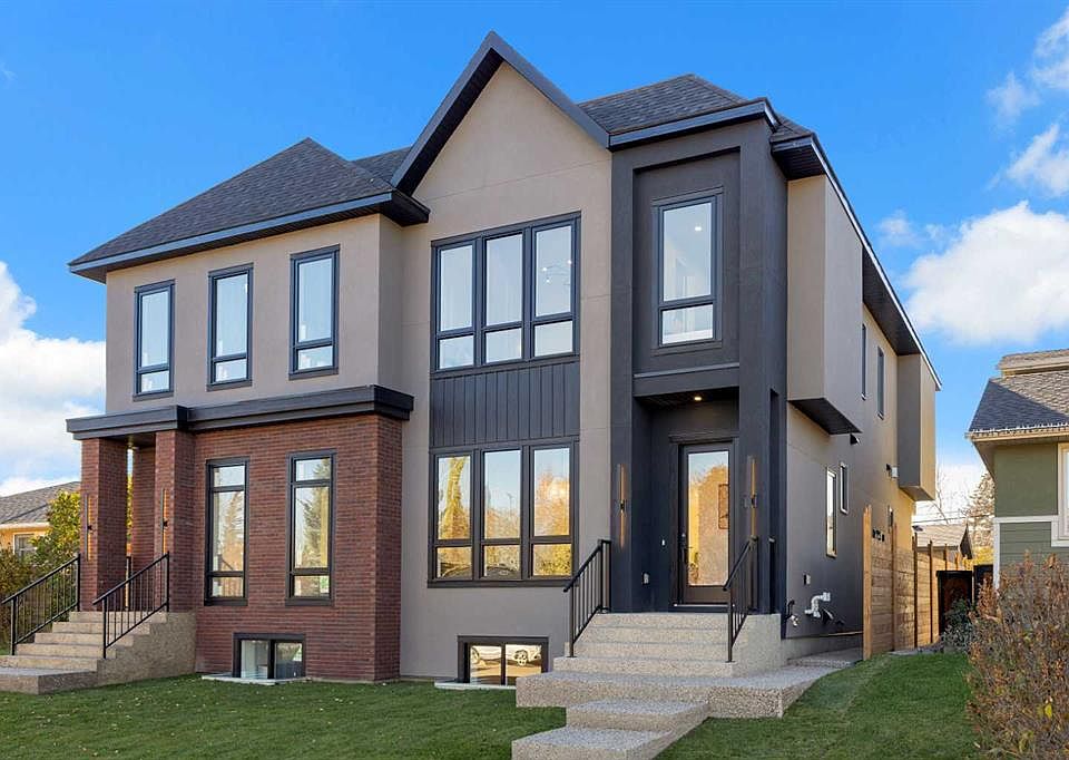 LOCATION LOCATION! Built on a quiet street only steps to West Confederation Park, this BRAND-NEW semi-detached infill in Banff Trail offers a superb floorplan with a LEGAL BASEMENT SUITE (Approved with the permit & subject to final inspection by the city). Banff Trail is well-situated in inner-city NW, with lots of outdoor recreation, schools, & shopping nearby. Confederation Park & the Charleswood Tennis Courts & Splash Park are a quick walk down the street, the City of Calgary toboggan hill is only 6-mins away, and the Confederation Park Golf Course is only 10-min down the road; a quick 9 holes after dinner can be a weeknight reality! Banff Trail School is mins away & Calgary Montessori School, Branton School, Rosemont School, and St Francis High School are all close by, with SAIT & UofC a short bike ride away. Dining options, shopping, amenities, and more are all at your fingertips, with Banff Trail, North Hill Centre, and all the businesses along Crowchild easily accessible from this inner-city location. With an amazing layout & premium finishes, you’ll discover a beautiful blend of both a stylish & functional lifestyle. This home features several upgrades, including engineered hardwood & 10-ft ceilings on the main level, soaring ceilings on the upper floor & a fully-developed basement w/ a LEGAL SUITE. The main floor boasts large primary living spaces, including a bright front dining/flex room, a large central kitchen with an oversized island w/ bar seating, ceiling-height custom cabinetry, and built-in pantry & coffee station. The large rear living room is finished w/ an inset gas fireplace w/ modern full-height surround, built-in millwork, and large windows overlooking the SOUTH back patio – perfect for family gatherings! A rear mudroom hosts a bench with hooks, with direct access to the double detached garage out back and an elegant, private powder room. Upstairs, you'll find the two secondary bedrooms w/ built-in closets, a spacious laundry room and a main 4-pc bath w/ modern vanity and a tub/shower combo w/ full-height tile surround. The primary suite features a soaring vaulted ceiling, multiple tall windows for tons of natural light, and a large walk-in closet w/ built-in storage. The 5-pc ensuite shows off with heated tile floors, glass shower w/ full-height tile, a free-standing tub, a modern vanity, dual under-mount sinks, and a separate water closet. The fully-developed LEGAL BASEMENT SUITE (approved in the development permit by the city) enjoys private access through a secure side entrance, two generous-sized bedrooms w/ built-in closets, a spacious and contemporary 4-pc bath w/ modern tile & vanity, large windows, space for a washer & dryer, plus a large living room area! The kitchen is thoughtfully arranged with quartz countertops & full-height cabinetry. Take a drive by this property and see how this house & fantastic location will suit your family perfectly! * Photos from Show Suite finishes may vary slightly*