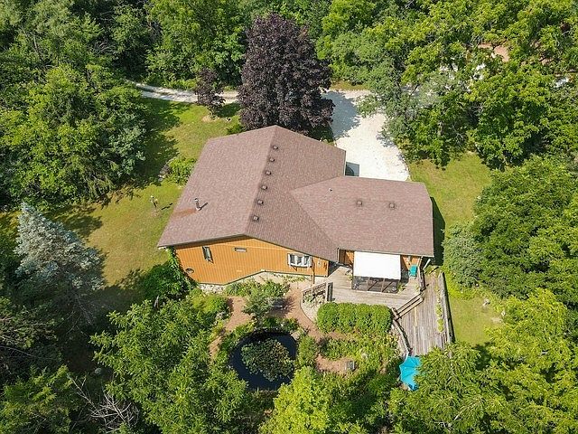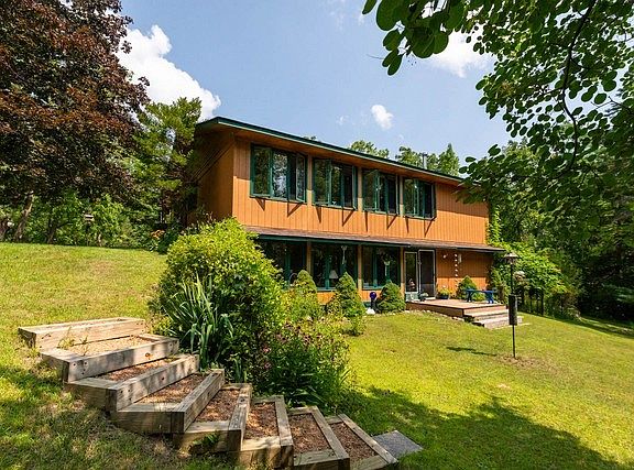 Nature lover's paradise: hilltop setting, meticulously maintained solar envelope ranch-style home with walkout finished basement ,attached 2-car garage. Five acres of rolling terrain, Pekul shop with 3 additions, several sheds, one with tiny front porch , incredibly private, groomed walking paths, mature oak, hickory, black walnut trees, Perennial flowers (hostas, blackberries, seasonal flowering plants throughout the property & around the lily pad pond approx. 20'x20' with waterfall below elevated rear deck). Burnham hot water boiler for hydronic baseboard heaters, climate controlled Pekul outbuilding (shop) with 100 amp service & AC, Modine propane heater (80,000 BTU), wall mounted electric (5,000 BTU 220 Vac) in rear shop, See "documents" for detailed list of features and improvements plus survey.