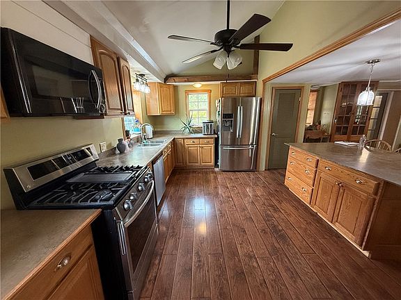 This home offers 3 bedrooms and 2 full baths, one conveniently located on each floor. The spacious layout includes a welcoming formal dining room with wet bar, a bright, open kitchen with a central island and newer appliances. From the dining room, exit through the French doors to be met with a covered deck and a cozy screened porch, perfect for entertaining or taking in the beautiful scenic views. A first-floor laundry adds modern convenience.