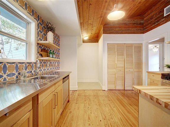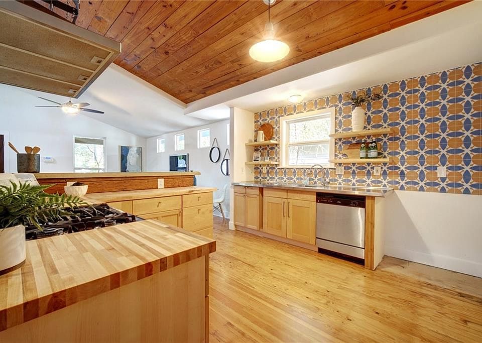 Lots of history in this well laid out 3-bedroom, 2 full bath, 1200 sq ft, 1954 bungalow. This home was taken down to the studs in 2005. Original hardwood floors recently refinished feature some extinct long leaf pine once common to Central Texas. Kitchen boasts custom reclaimed wood vaulted ceilings. The custom limestone bar countertop was crafted with the help of acclaimed local stone carver (and 6 generation Austinite!) Stuart Simpson of Austin Stone Carving. The custom shelves and backsplash, gas stove w/ SS vent hood, and sit down bar are great for entertaining. The butcher block & stainless-steel countertops are perfect for the active cook. Spacious master w/ French doors leading to an exterior back deck, dual vanity, walk-in closet. Newly renovated 2nd bathroom w/ walk-in shower & floor to ceiling subway tile. Spacious front porch w/ Brazilian Massaranduba decking (bought at salvage from now gone Guthrie Lumber Company on 7th St.) Rare to find a restored custom home in this time of blow and go construction.