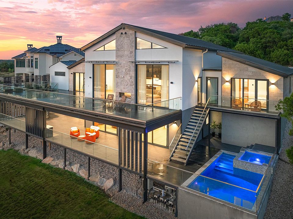 Stunning modern 4 bed 6 bath home in the Lakehurst community between Lakeway and Spicewood and within top rated Lake Travis ISD. Great for executive relocation and families. The home offers 180 degree Hill Country views, open living with a dual sided fireplace, a modern kitchen, a main level guest suite with private entrance, plus a lower level with two en suite bedrooms, a second living area with bar and a sauna. Outdoor areas include a pool, spa, covered kitchen and two story deck with river views. Furnished option available for an additional 2000 per month. Limited time incentives for leases signed before Dec 31: Option 1. First three months fully furnished at no extra cost. Option 2. First three months at 10000 per month if the client brings their own furniture.