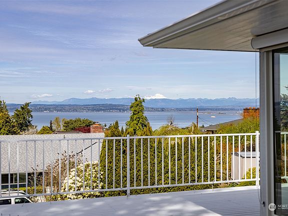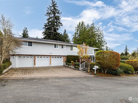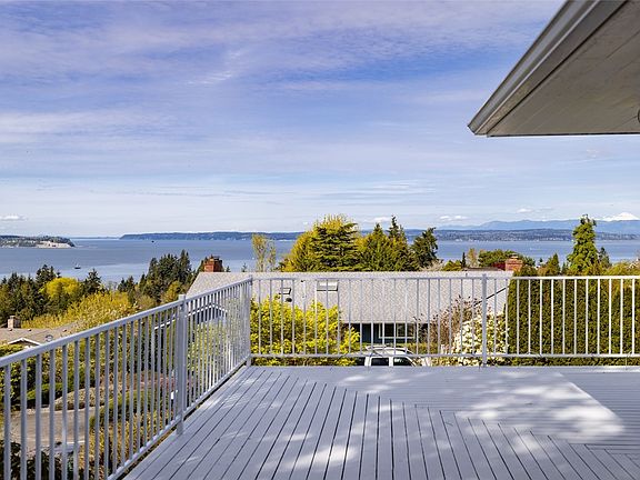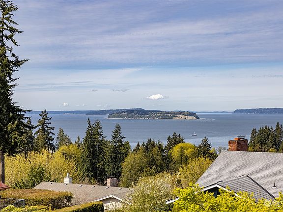 Breathtaking ocean, island, and mountain views abound at this gorgeously appointed, well kept home with abundant natural light. Rich hardwood floors, spacious kitchen w skylights, plenty of storage and workspace, stone surround fireplace, soaking tub and dual sinks, French doors to the office, beautiful stone tiled showers, wet bar, built-in vacuum. Spacious lower level with brick surround fireplace. Large, wraparound entertaining deck to take in the amazing surroundings. Private garden oasis backyard with stone patio, small shed, and mature trees and bushes. Partially fenced yard, three car garage with workspace.