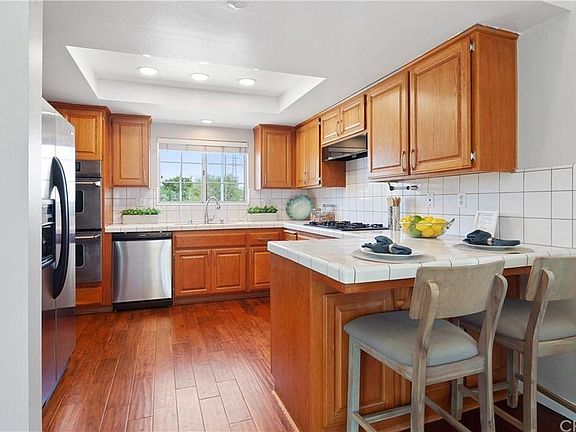 REMODELED 2014, top to bottom. New wood n wood laminate flooring, travertine in kitchen n baths. Granite kitchen counters with chocolate shaker style cabinets, stainless appliances and water purifier. Living room has vaulted ceilings with fans n reccessed lights with zone dimmers, travertine fireplace has built in speakers, and built in cabinet is wired for components. The patio is located off the living room. Custom top n bottom opening blinds, new interior doors w/frosted glass insets. Master ensuite is upstairs, bathroom has separate shower and massage tub, marble counters. Downstairs has 2 bedrooms and full bath as well as laundry room and special shoe closet. Home is wired for cat 5, has home water purifying system in addition to kitchen's. Solar system and tankless water heater. Also an additional water pump to increase water pressure if you desire. 2-car garage has new door, electric car ready and is attached with direct access.