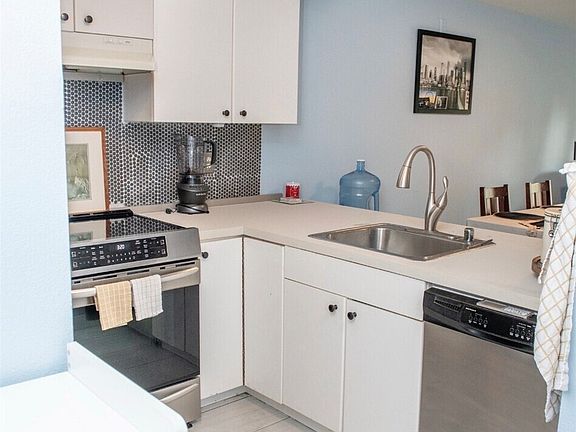 Modern kitchenCustom light fixturesShared fenced backyardStainless steel appliancesStylish tile backsplash