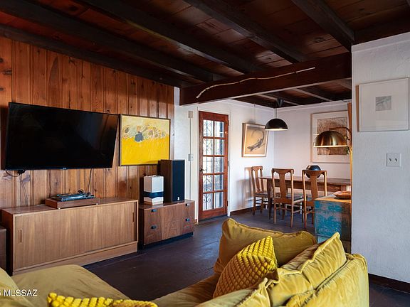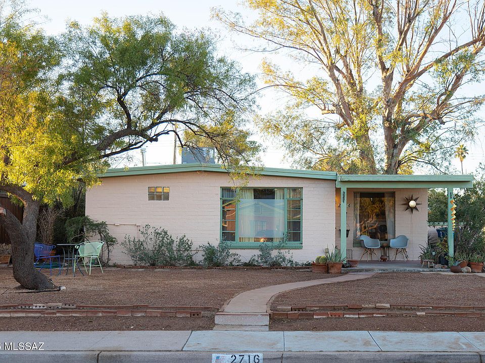 Charming Mid-Century Bungalow, built circa 1955, in Arroyo Chico! Experience character & convenience in this quintessential Central Tucson home. This 3-bed home has a bonus room, ideal as a 4th bedroom or office/den.Enjoy original and natural style with wood-beam ceilings, beautiful porcelain slate tile, and built-in cabinetry. The kitchen features original cabinetry with black and stainless appliances. Comfort is guaranteed with Central AC + Mini-split, and a whole-house water purification with RO system in the kitchen.Prime location is key! You are steps from the Treat Bike Blvd, blocks from Reid Park, and easily walk the footpath through Broadmoor to Broadway Village shopping. Broadway TJs coming soon! Features a private yard, mature trees, carport, space for RV parking, and more.