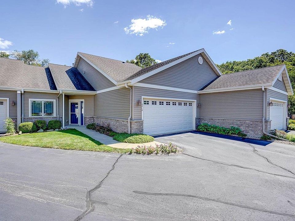 55 and above, 2 bedroom, Ranch style condominium with open floor plan, wood floors, three season porch and full basement. Separate entrance into foyer opening to dining, living and kitchen. Three season porch overlooks wooded rear yard setting. Walk in from the 2 car attached garage into a spacious laundry room with utility sink and pantry. Basement has windows allowing in natural light and would be great for future finish. Lower level also rouged for future bath.