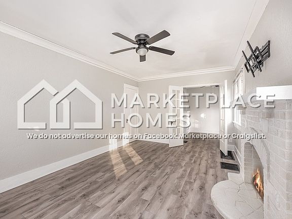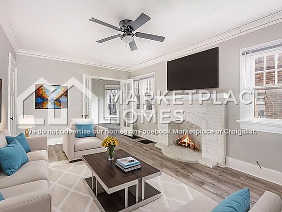 Cozy brick fireplace hearthStylish flooringNeutral finishesTimeless designUpdated kitchenSleek stainless-steel appliancesElegant french doors