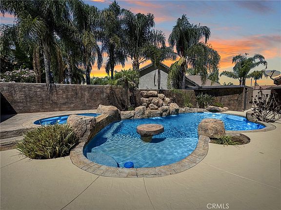 Step into your own private resort with this entertainer’s dream home, where every detail has been designed to elevate your lifestyle. Imagine sun-drenched afternoons spent around the shimmering Pebble Tec saltwater pool and spa, the soothing sound of a rock waterfall in the background, cool decking under your feet, and friends gathered around the built-in BBQ and bar while an outdoor gas fireplace flickers into the evening. Privacy and beauty surround you with custom stamped and etched concrete, a secure storage area for pool equipment, and a welcoming front courtyard that sets the tone the moment you arrive. The massive driveway provides endless vehicle storage possibilities, including room to park your RV or boat. Inside, light pours through tinted windows onto plush new carpet and luxurious laminate wood floors. The remodeled gourmet kitchen is as stunning as it is functional, with sleek European cabinetry featuring soft-close drawers and pull-outs, LED lighting above and below, granite countertops, a full custom backsplash, and upgraded black stainless Samsung appliances—including double oven, refrigerator, microwave, dishwasher, and a gleaming stainless farmhouse sink. In the heart of the home, the family room beckons with crown molding, shiplap wall, wood shutters, built-in desk, cozy fireplace, and an included 75-inch TV. Throw open the French doors and the indoors flow seamlessly to the expansive patio and pool beyond. Solar panels for both the home and pool, a whole-house fan, newer A/C condenser, and tinted windows keep comfort high and costs low. A massive primary closet, an executive office/bedroom with quartz work surface, and a separate laundry room with washer and dryer complete the picture. Set at the end of a peaceful cul-de-sac with low taxes and no HOA, this home doesn’t just offer features—it offers a way of living: luxurious, efficient, and perfectly suited for unforgettable gatherings and everyday enjoyment.
