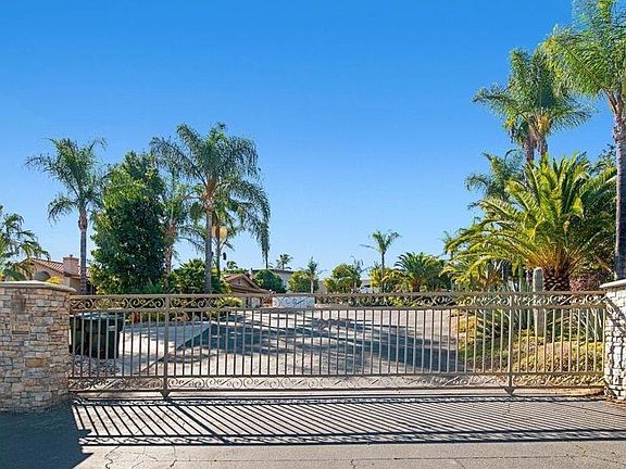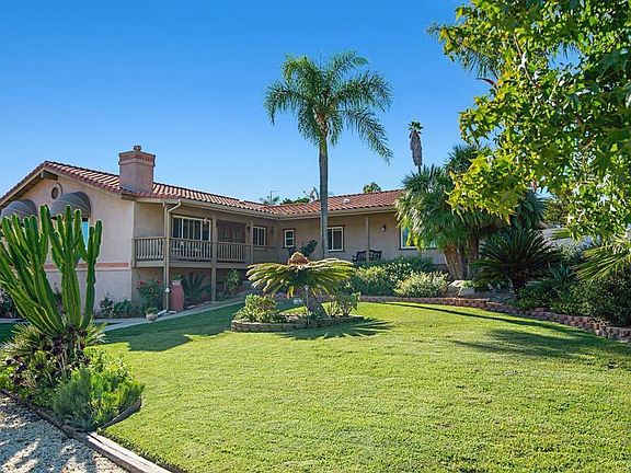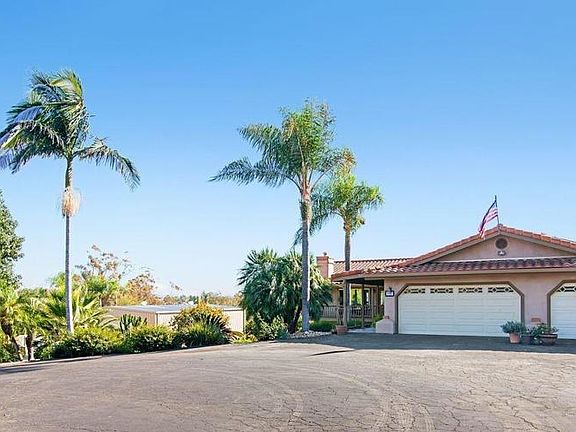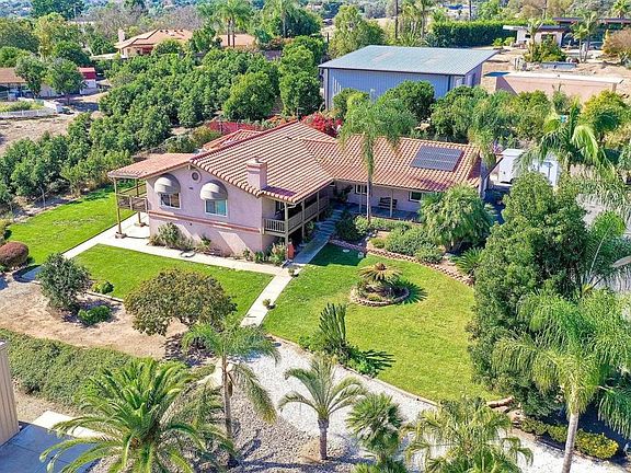 Meticulously maintained 3 bedroom/2.5 bath PLUS office single story home located on a peaceful cul-de-sac. Enter through the automatic gate and you’re immediately taken in by the beautiful landscaping complete with mature palm trees, green grass, blooming roses, fruit & avocado trees. This SOLAR home has an abundance of windows and sky lights making it light and bright throughout. The living room, dining room & primary suite have lofty, wood beamed ceilings and rich wood floors. The 1-acre property is laid out perfectly so you can enjoy the beautiful views and soft breezes from inside or from either Alumawood deck located across the front and back of the home. At the bottom portion of the property is a huge 40’ by 60’ WORKSHOP with a 14’ electric door, 50-amp circuit & commercial air compressor. Next to the workshop is a cement pad with room for your RV or other toys. Behind the house is a quaint sitting area with a jacuzzi to enjoy while unwinding from a long day. The kitchen has been well appointed with granite counters, large island with prep sink and stainless-steel appliances. The primary suite has its own sitting area with a large picture window to take in the views. The primary bath has been remodeled with a gorgeous stone shower. The living room has tons of windows to showcase the professional landscaping and views of the hills. This home is also perfect for guests or extended family with a private sitting room, bedroom & full bath. Just a few of the upgrades include tankless water heater, leaded glass double front doors, 5" baseboards, newer windows & wood floors. This beautiful home is conveniently located just minutes to the I-15 making your commute a breeze. Fallbrook is an amazing community with great schools, restaurants, shopping, and there is always some fun activity going on for the entire family to enjoy!