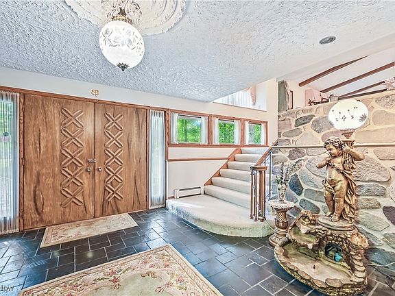 Stunning custom built Granite stone 4 level split. Over 4200 Sq. ft., 4/5 bedrooms, 3.5 baths, on 3.37 acres with 400 foot of frontage. In-law suite with Open Great room area with full Kitchen and stone fireplace. Grand dual door entry to large greeting foyer stone display and planter area. Large formal living room with stone fireplace, bay window and vaulted beam ceiling. Formal dining Rm. Eat in Kitchen with jenn-air cook top, wall oven, appliance garage & desk area. Large Sun Rm with built in Bar B-Qu grill and large circle stain glass window. Family Rm with slider to cover patio. One first floor bedroom. Main level laundry Rm. with storage and sink. Fourth level has master suite with slider to balcony deck, Custom lighted make up vanity and dressing area off master bath. 2nd bedroom is 20x11 and could be divided into 2 Bedrooms with one wall. The third bedroom and main bath with garden tub complete the 4th level. Lower level has workshop with built in cabinetry and steps to attached garage. This area is also used as storm shelter. Central vacum,whole house fan, intercom and radio. Home wired for generator. total of 5 car garages, 2 car attached garage, 3 car + w/workshop area detached (24x32.) 3 Sheds. All have electric. Cement circle drive and paved area to 3+ car garage. Three lots for 3.37 with 400 foot of frontage. Sit in the gazebo and take in the views of this beautiful property. If quality and attention to details is your requirements don’t delay call today for a private showing. Wethersfield TWP., Niles City Schools.
