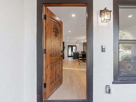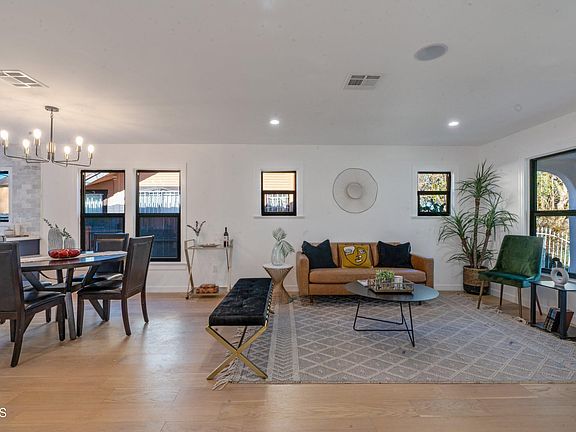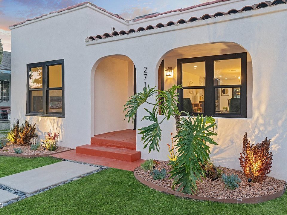 Nestled along a picture-perfect palm tree-lined street in West Adams is this stunning 1920s Spanish revival home. Every inch of the gorgeous 1,264 sqft layout has been meticulously updated to combine the home's classic character and charm with the very best in today's contemporary comfort and elegance. A striking speakeasy paneled wood door invites you to step inside and explore the light-filled interior. Engineered wood floors flow underfoot throughout the open-concept living and dining space and continue into the exceptional chef's kitchen. Anyone with a flair for food will fall head over heels for this flawless space with an oversized 7ft quartz island set right in the heart. There are also shaker kitchen cabinets and gold fixtures along with veined countertops, a soft gray marble backsplash and a suite of all-new stainless steel appliances including a wine cooler, refrigerator, dishwasher, five-burner stove and hood vent. From here, French glass doors draw you out to the sun-soaked rear wood deck where you can host guests and admire the landscaped backyard. There are three bedrooms and two bathrooms including the primary bedroom with French doors to the deck and an ensuite with a frameless glass shower, Spanish-style tiled flooring and a floating wood vanity. The second bathroom is just as beautifully finished with bold geometric patterned flooring, a wood vanity and original cabinet built-ins. The list of extra features is extensive and includes new central AC and heating, double pane windows and a Nest thermostat. There's a Ring doorbell, a finished garage and built-in Bluetooth sound for endless hours of entertainment. Outside, the 5,000 sqft lot has new wood fencing and a front yard irrigation system plus drought-resistant landscaping and a lighted pergola. This central and sought-after location ensures you will have everything you could ever need at your fingertips promising a life of absolute convenience for the new owners of this remarkable residence. The USC Campus is just moments from your new home and you're also within easy reach of Exposition Park and the upcoming Lucas Museum of Narrative Art. Shopping, dining options, public transportation and the I-10 are all at your fingertips.