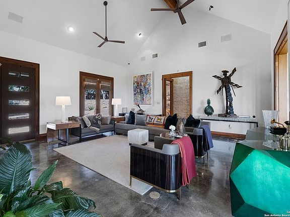 Your own private Hill Country haven just minutes from I-10. A truly exceptional 5.93-acre retreat that backs to an 800-acre private preserve, offering spectacular panoramic views, unmatched privacy, and the freedom of unrestricted living. This peaceful estate features a 3,272 sqft custom Rustic Contemporary home designed for comfort and elegance. Soaring vaulted ceilings and limestone accent walls create a dramatic yet warm atmosphere in the living and dining areas. The gourmet kitchen is a chef's dream, boasting a massive granite center island, custom cabinetry a striking copper vent hood, Viking gas range, and a generous breakfast area that invites casual dining with stunning views. The spacious primary suite is a private sanctuary with patio access, a spa-inspired bath featuring dual granite vanities, frameless glass shower, and custom his-and-her walk-in closets with built-ins. The split floor-plan ensures privacy, with generous secondary bedrooms thoughtfully positioned away from the master wing. Step outside to a screened patio, fully fenced grounds and multiple luxury lifestyle amenities. A detached 850 sqft gym with a full bath offers flexibility as a fitness space, guest house, or creative studio. Adjacent is a spa for the ultimate relaxation. Entertain effortlessly at the outdoor kitchen, complete with a pizza oven and authentic Argentine grill. For the enthusiast or collector, the property includes a massive 2,400 sqft climate-controlled garage perfect as a mega man cave, workshop, or car collector's dream setup. In addition to the main garage, the property includes general garage parking for 10+ more vehicles, offering a total setup that's virtually unmatched for nearly 20 vehicles. Whether you're a serious collector, hobbyist, or just want the ultimate space to store, work, and entertain - this property delivers on all fronts. State-of-the-art security with RFID gated entry that ensures both privacy and convenience. This is Hill Country living at its finest. Luxury, freedom, and endless views. Schedule your private showing today.