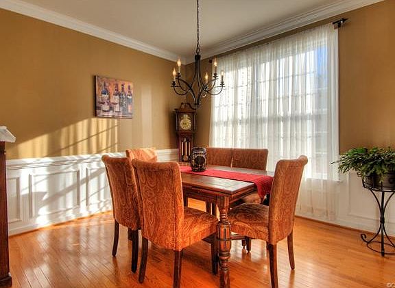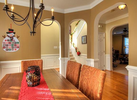 Treat yourself! This home is magnificent! Inviting and open foyer with hardwood floors crown and picture frame molding, columns separate entry from the dining room which has hardwood floors and crown molding. Open family room and kitchen combo, great for entertaining. Generously sized family room has recessed lighting, carpet, and a cozy gas fireplace. Adjoining kitchen is open and has attractive corian countertops and custom tile backsplash, breakfast bar, stainless appliances, 42" maple cabinets, pantry, and breakfast nook. Additional living space in the sunroom located off of kitchen - light and airy space with carpet, ceiling fan, and crown molding. Sellers have painted the garage and added storage. Upstairs are five large bedrooms. Master suite has a walk in closet, ceiling fan, carpeting, and a private bath. Master bathroom has ceramic tile floor, adult height double vanity, soaking tub, and separate shower. All other bedrooms have carpet, large closets, and ceiling fans. Additional Features include: Second level laundry room, play set that conveys, 10x24 deck with pergola above, entire yard irrigated, rear yard fenced, heavily landscaped, concrete driveway.