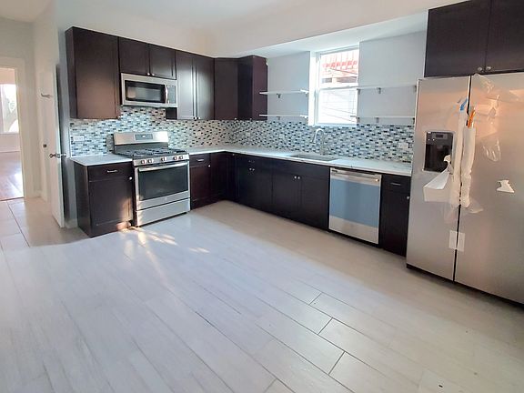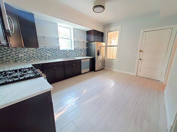 A partial rehab gave this unit a brand new large kitchen in 2021 with SS appliances including dishwasher and huge single bowl sink, a new bathroom, and a new washer and dryer along with new central AC and heat and new windows. There's a large shared deck and back yard. The unit is large with a full dining room connected to a full living room and large kitchen. There is a door connecting two of the smaller bedrooms for a direct commute to "the home office" if desired. Landlord is onsite.