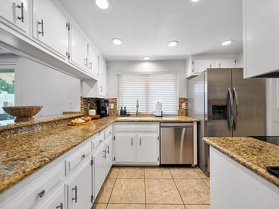 Granite kitchen countertops and tile flooring throughout