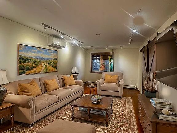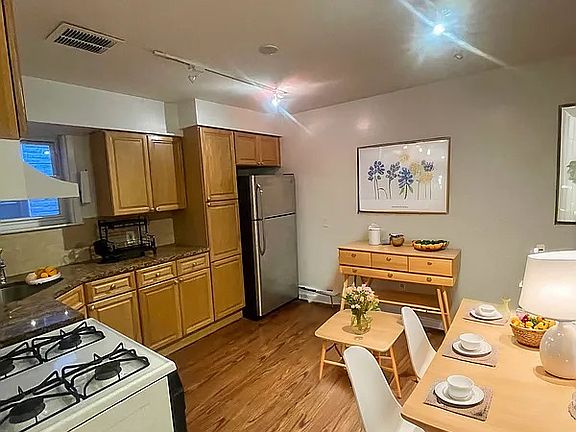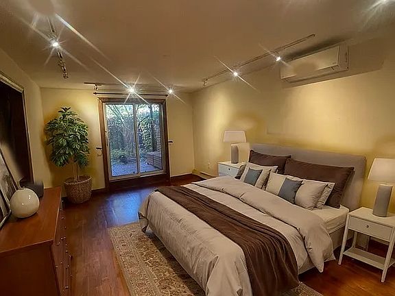 Inside, the apartment features stunning hardwood floors and stylish track lighting throughout, creating a warm and inviting atmosphere.