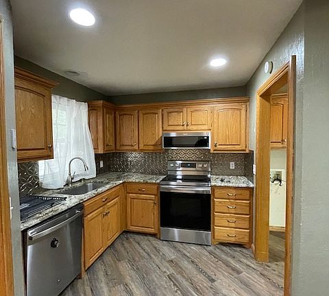 Big windows, covered back porch, large master bathroom, granite and new appliances in the kitchen are just a few of the things that will make this home rent quickly. The kitchen has a fridge included and a water softener in the garage. Beautiful fireplace and woodwork give a warm and cozy feeling. There is a large downstairs basement room painted and carpeted for an extra living or bedroom space. The master is on the main floor with 3 bedrooms upstairs. There is a bathroom with a shower upstairs also. The 2 car garage has a storm shelter in ground access. We also updated flooring on the main level. This home is part of the heritage hills community. You have access to the walking trails and green belt. There is nearby grocery, shopping, and it is in the Prairiview School district. Only approved pets allowed. No smoking. one year lease term. renter cares for yard and pays all utilities.