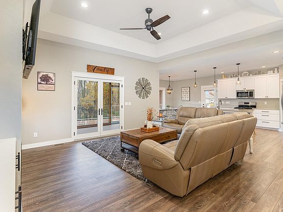 The home that has it all! Built in 2018, this stunning move-in-ready home offers modern elegance and thoughtful design. The inviting exterior and manicured landscaping lead into an open-concept floor plan with vaulted ceilings and abundant natural light. A cozy fireplace and built-ins enhance the living room, while the modern kitchen boasts stainless steel appliances. The spacious primary suite features a luxurious bath with a walk-in shower and double vanity. The finished basement has in-floor heat and a large family room, perfect for relaxing. The heated 3-car garage includes in-floor heat, a humidistat, ample storage, and a bonus bar hangout area. Outdoors, a charming porch opens to a wraparound deck, partially screened for comfort, overlooking a large backyard with a firepit, shed, and scenic views. A phone-controlled sprinkler system adds convenience. This home is a must-see!