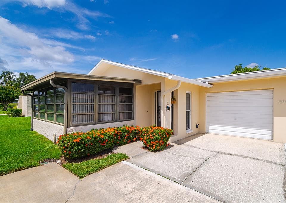 Welcome to this charming and beautifully maintained 1-bedroom, 1-bath villa with a 1-car garage, ideally situated in the highly sought-after 55+ Highland Lakes community. Whether you're looking for a full-time residence or a seasonal retreat, this home offers a perfect blend of comfort, convenience, and vibrant community living. As you step inside, you'll be greeted by a bright and airy atmosphere, highlighted by large floor-to-ceiling windows and fresh neutral paint throughout. The spacious main living area features brand-new vinyl plank flooring and an open-concept layout that connects seamlessly to the dining space. A large utility and coat closet provides added storage. Relax with your morning coffee or unwind in the evening in the enclosed sunroom, measuring 15 by 9.5 feet, featuring brand-new indoor/outdoor carpeting, a dedicated A/C unit, and sliding glass doors that let in Florida’s fresh breeze. The kitchen includes updated cabinet doors, a built-in microwave, a dishwasher, and a convenient pantry closet. The generously sized bedroom offers two walk-in closets, brand-new flooring, a vanity counter with a sink, and private access to a secluded patio through sliding glass doors. The bathroom provides dual access from both the bedroom and hallway and includes a tub/shower combination. In the attached 1-car garage, you'll find the washer, dryer, utility sink, and additional shelving for storage. This home also boasts a new A/C system installed in 2024 and updated windows and a sliding glass door (2012) with fabric hurricane protection. The villa is condo-owned—no land lease required. The all-inclusive HOA covers water, sewer, garbage, cable (with two boxes and internet), exterior maintenance such as roof, painting, and concrete/asphalt repair, as well as landscaping, irrigation, pest service, and building insurance. As part of the Highland Lakes master association, you’ll have access to exceptional amenities including three executive golf courses, a resort-style pool, two clubhouses, tennis, pickleball, bocce, shuffleboard, a woodshop, pottery and arts & crafts studios, an auditorium with shows and concerts, and private lake access with two pontoon boats on Tarpon Lake. All of this is conveniently located just minutes from top-rated beaches, shopping, dining, medical facilities, and beautiful parks. Don’t miss your chance to make this delightful villa in Highland Lakes your own—schedule your private showing today.