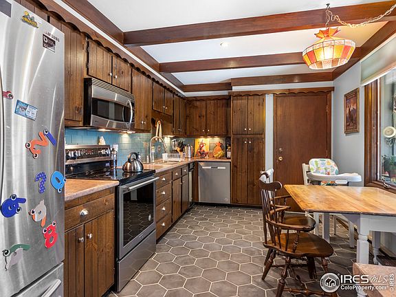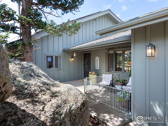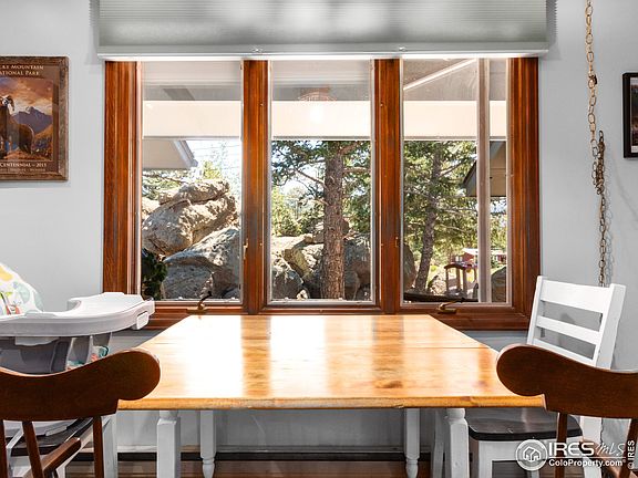 Open floor plan home on 1.3-acre private wooded lot in cul-de-sac. 3 beds/3 baths. New flooring throughout. Wood floors in living & dining room. New tiled entryway & kitchen. Updated bathrooms. Eat-in Kitchen. Oversized garage with additional room for a gym or workshop. Dog run. Big deck with great mountain views. Large windows showcasing 360 mountain views. Level driveway, spacious for multiple cars. Owner owned solar. 10 minutes to downtown Estes & RMNP