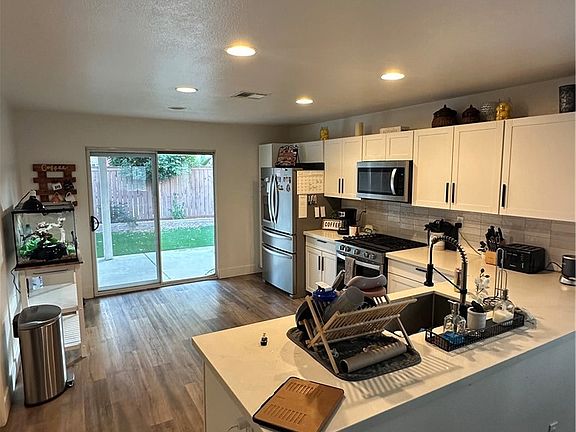 This home exudes a genuine sense of ownership pride, evident through its fresh interior and exterior paint, new door hardware throughout, and the introduction of upscale, waterproof luxury vinyl plank flooring throughout the living spaces, complemented by plush carpeting in all bedroom areas. The inviting family room showcases a striking shiplap accent wall, abundant natural light, recessed lighting, and a ceiling fan, creating a warm and welcoming atmosphere. Adjacent, a cozy dining area seamlessly connects to a splendidly renovated kitchen, featuring pristine white shaker-style cabinetry, elegant quartz countertops, stainless steel appliances, and a convenient walk-in pantry.
