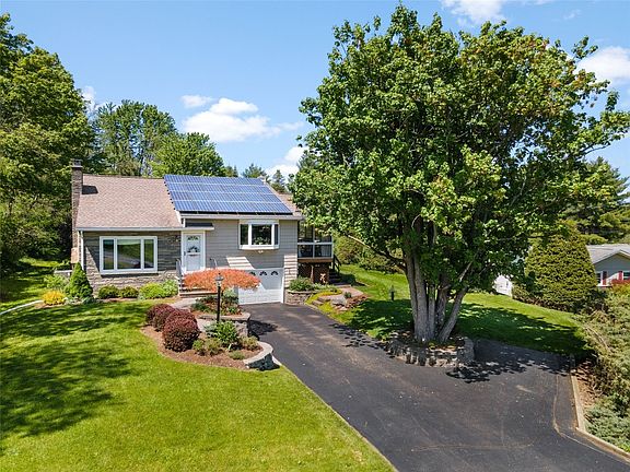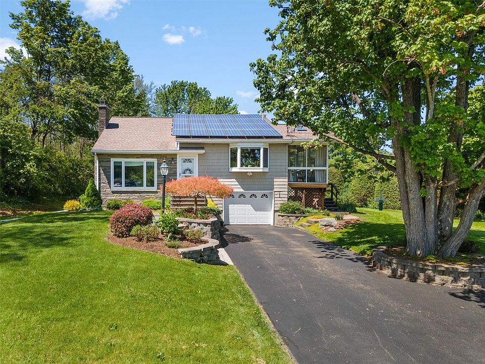 Beautiful Country home with outstanding views from your deck! The pride of ownership is shown throughout this immaculate contemporary split level home. As you enter the home you can take a few steps down to the living room, which has a stone fireplace w/gas insert & hardwood floors, and vaulted ceilings, or to the right you enter the eat in kitchen or the dining room which overlooks the living room. Off the kitchen you have access to the screened in porch perfect for your morning coffee! Through the screened in porch you have your open deck! The 3 bedrooms & full bath are also on this upper level. The LL is a walk out to your large flat yard, there is a family room, large laundry room with added sauna and full bath. The last level has your utility room & storage. The improvements the owner has done over the last 44 years are incredible, they include everything from the decking, siding, roofing, gutters, solar panels allowing you for a minimal bill. ** Whole house generator incl.