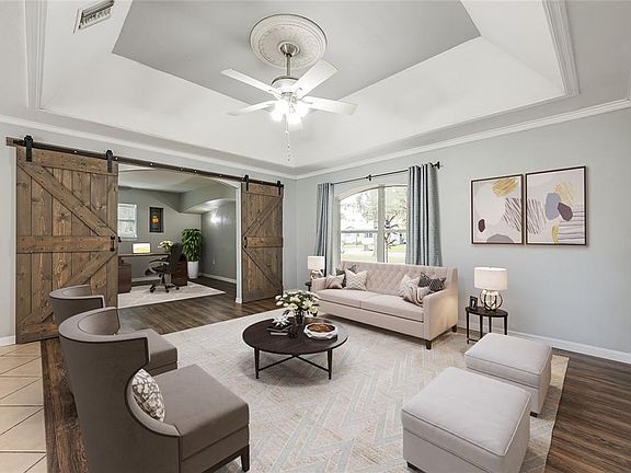 One or more photo(s) has been virtually staged. **Ask about a lender provided RATE BUY-DOWN CREDIT on this home!**Seller may consider buyer concessions if made in an offer**Set on a sprawling 1.71-ACRE DOUBLE PARCEL in Plantation Estates of DeBary, this 3-bedroom, 2-bath home offers room to breathe, modern updates, and endless potential SURROUNDED BY NATURAL BEAUTY. With tranquil conservation land and a natural water feature stretching behind the property, this is a rare opportunity to enjoy PRIVACY, SPACE, and CONVENIENCE all in one. RECENT UPDATES bring comfort and confidence, including a NEW ROOF (2025), NEW CONCRETE PORCH, and an UPDATED GUEST BATH. Inside, NEWER LAMINATE FLOORING enhances the Living room and Office, while all bedrooms also feature laminate flooring for easy care and a cohesive look. The Living and Dining combination is open and inviting, with a TRAY CEILING and arched cutouts adding a touch of architectural style. SLIDING BARN DOORS reveal a large Office with BUILT-IN SHELVING, a versatile bonus space converted from the garage—perfect for working from home or pursuing hobbies. A graceful curved doorway leads to the Kitchen, complete with SOLID WOOD CABINETRY, tile countertops, and a breakfast bar, ideal for casual meals or morning coffee. The Primary Bedroom offers an EN SUITE BATH, while two additional bedrooms provide plenty of space for family or guests. Step outside to enjoy a covered patio overlooking the EXPANSIVE BACKYARD, where you can unwind, entertain, or take in the surrounding PEACE and PRIVACY. Practical features like an RV HOOKUP, electrical connection for a whole-house generator, and NO HOA make this property as functional as it is inviting. There’s truly so much potential for what you can do with the land. Located close to Gemini Springs Park, DeBary Hall Historic Site, and the St. Johns River, OUTDOOR ADVENTURES are always nearby. Easy access to I-4 and US-17/92 makes commuting simple, with Sanford, Lake Mary, Orange City, and Deltona all within minutes—and both DAYTONA BEACH and DOWNTOWN ORLANDO less than an hour away. SPACIOUS, UPDATED, and surrounded by NATURAL BEAUTY, this Plantation Estates home provides a lifestyle of comfort, flexibility, and opportunity. Don't miss your chance to call this Home!