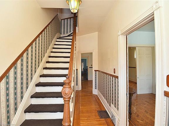 This solid brick Victorian home, built circa 1900, is located just two blocks from Hamilton General Hospital. The two-storey house features four bedrooms, one bathroom, and a private rear laneway with parking for two vehicles. Inside, the home retains its original character with hardwood floors featuring inlay, pocket doors, and 9-foot ceilings on the main level. The parlour includes a gorgeous detailed faux fireplace, and the layout offers both a full formal dining room and an eat-in kitchen. Conveniently situated near public transit, shopping, and local amenities, the property is also just minutes from Bayfront Park and the marina. A great opportunity in a central location.