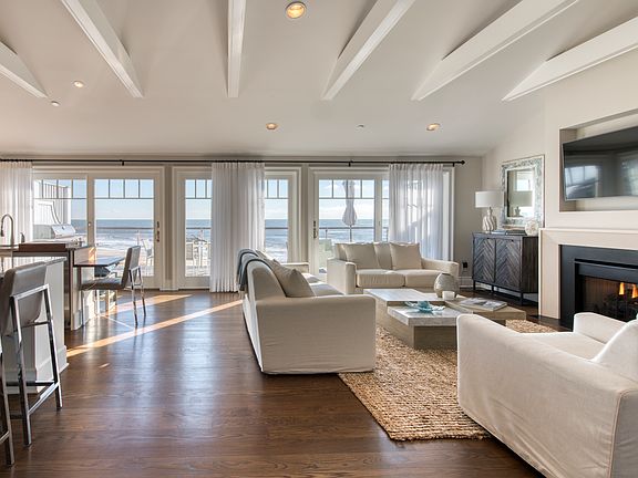 sq. ft., indoors and outdoors, presenting direct and unobstructed ocean views from every room. Enter to open, airy, light-filled living areas, with vaulted ceilings and a wall of floor to ceiling glass doors and windows showcasing dramatic panoramas of sea and sky and flowing out to an oceanfront terrace. Ideal for entertaining, the living area with fireplace, media and comfortable seating flows seamlessly to the well-equipped eat-in kitchen providing counter seating and high end stainless steel appliances. A formal dining area is immediately adjacent. The spacious first floor master suite has glass doors to a terrace, and features a walk-in closet and luxurious bath. A second bedroom suite, also with glass doors to the terrace, and a laundry room complete this level. Two more en-suite bedrooms with glass doors to a patio with a hot tub are located on the lower level. A private beach cabana and access to Gurney's fine dining venues and the Seawater Spa make this an amazing beach get-away.